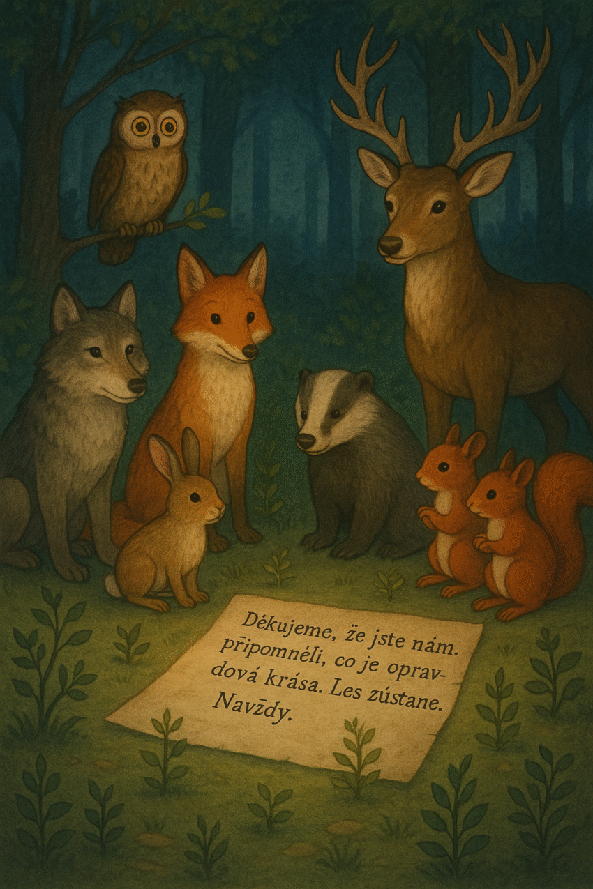 Daleko za sedmero kopci se rozprostíral hluboký les, ve kterém žila zvířátka chytrá liška Líza, opatrný vlk Vavřinec, veselý zajíc Zbyněk, moudrá sova Sofie, pracovitý jezevec Josef, zvídavé veverky Bára a Klára a statný jelen Jaroslav, kterému všichni říkali „pan lesní“.Les byl zelený, voňavý, plný života a písniček ptáků. Každé zvířátko mělo své místo a…
